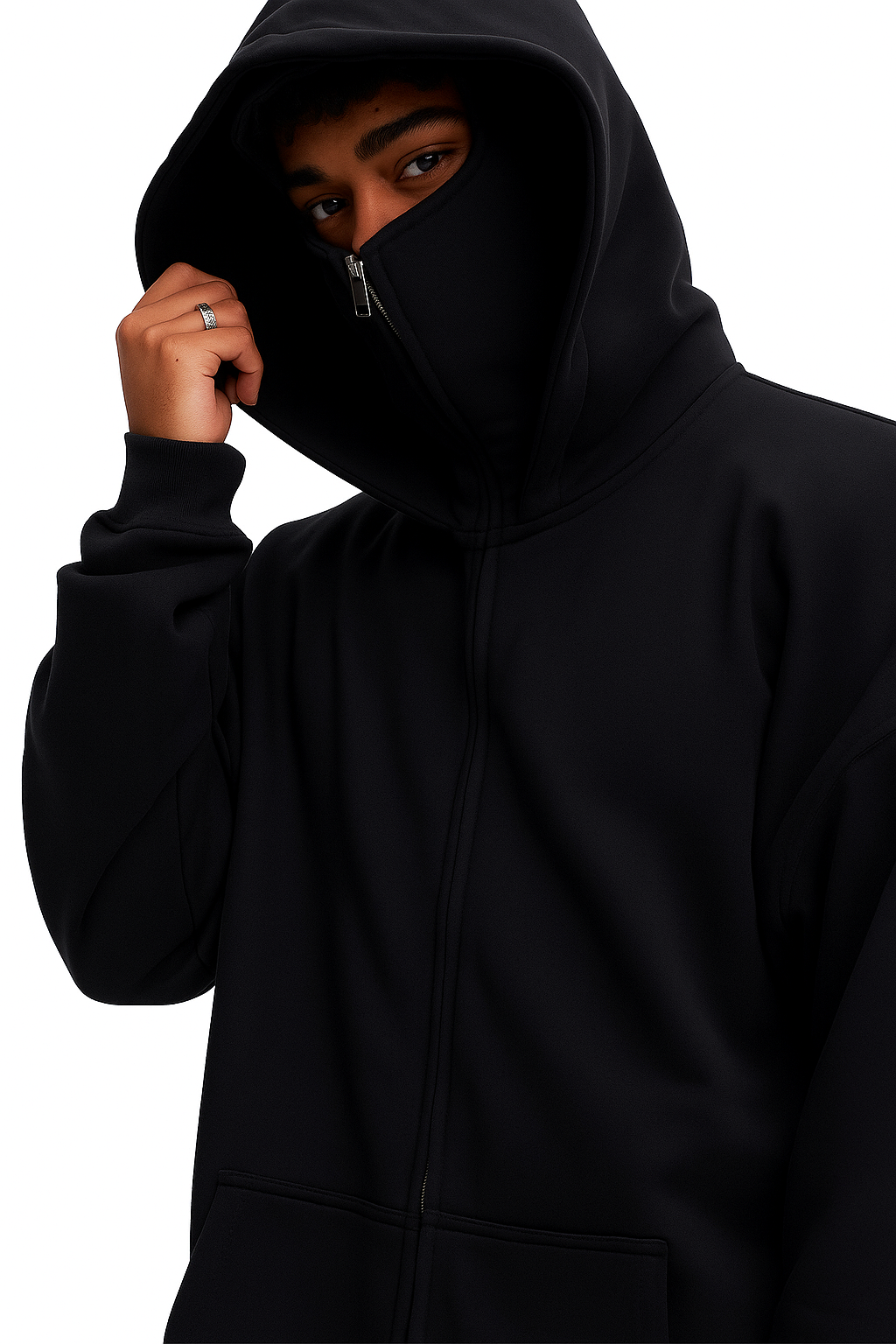 Unisex double-hooded sweatshirt with built-in mask. A bold Y2K Harajuku look for winter streetwear.